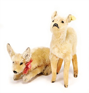 2-tlg., Vorkrieg, Rehe, 1x Rehkitz, liegend, mit Knopf, langgezogenes f, L: 20 cm, 1 Reh, stehend, Stehhöhe: 22 cm, mit Knopf und Reste der gelben Fahne, langgezogenes f, Samtbeine