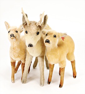 Konv. 3-tlg., 1 Hirsch, stehend, mit Knopf, Druckbuchstaben, langgezogenes f, mit gelber Fahne Nr. 1535/0, Stehhöhe: 31 cm, Knopf rostig, Fahne teilw. etwas fleckig, sonst sehr schöner Zust., 2 Rehkitz, 1x mit Knopf und roter Fahne Nr. unleserlich, 1 Rehkitz mit Knopf, Stehhöhe: 23 cm, schönes Konv.