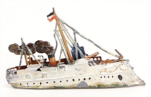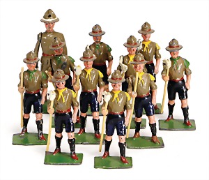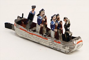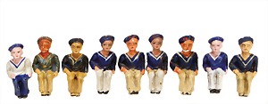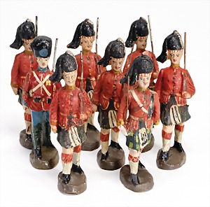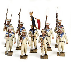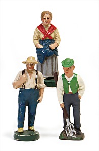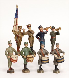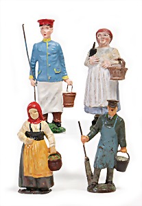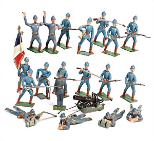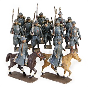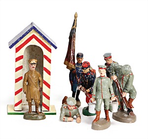Weltkrieg, 10 cm, Massefigure, 6 Teile, Mann mit Eimer, Mann mit Spaten, Fahnenträger, Franzosen stürmen, Lagerleben liegend, Mann mit Wärterhaus, dazu 1 Figur stehend mit Brille, ungem., meist Zust. 2