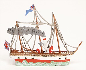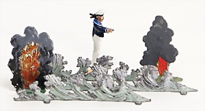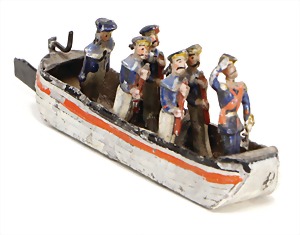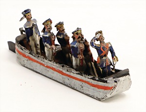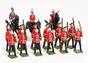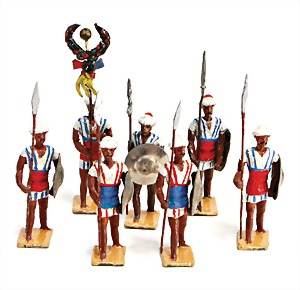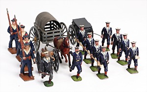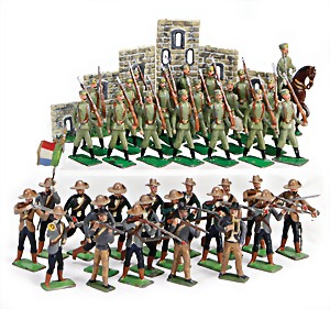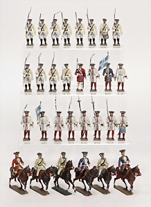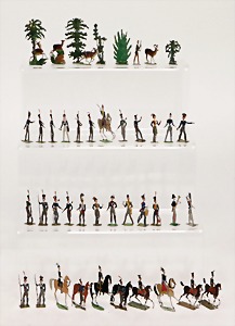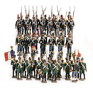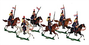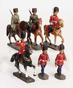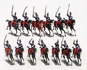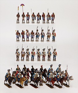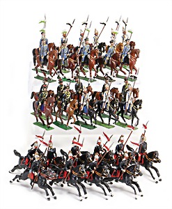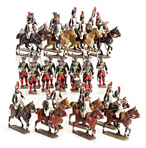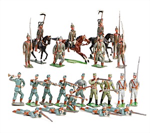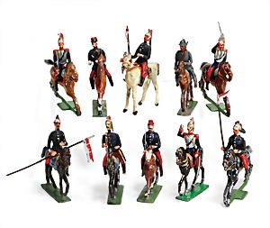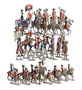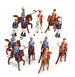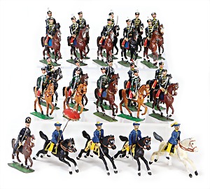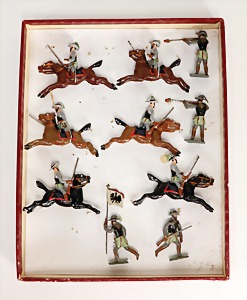 Zinn-Kompositionsfiguren, plastisch, H: 5 cm, 6 x Kavallerie, 2 stehend feuernd, 1 Mann mit Gewehr, 1 Fahnenträger, im Kart., ohne Aufdruck, guter Zust.