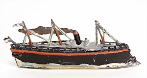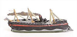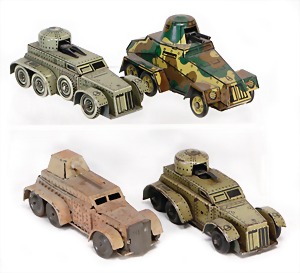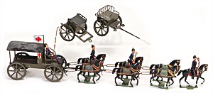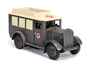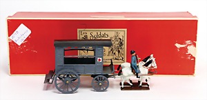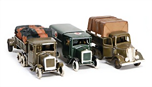 3 LKW`s, Guss, darunter 1x 3-Achser mit Kettenantrieb, 1 Lazarettwagen, 1x 3-Achser mit Plane, 1 Anhänger, Zust. 2-3, passend zu 5,5 cm Figuren
