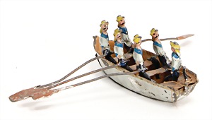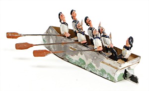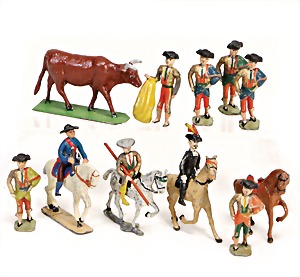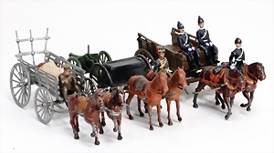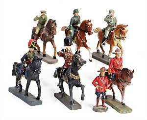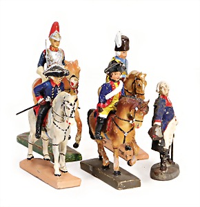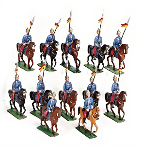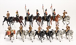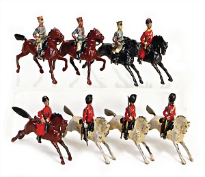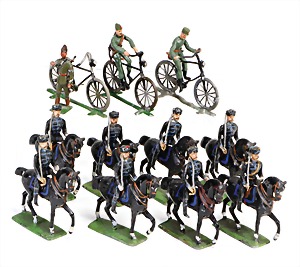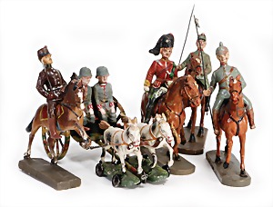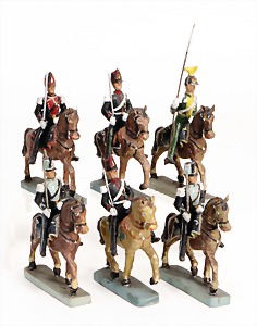 feine Metall-Kompositionsfiguren, Bavaria, 1907, plastische Zinnfiguren mit halbplastischen Pferden, insgesamt H: 9 cm, 6 Teile Kavallerie, Orig.-Kart., Seitenlaschen am Kart. fehlen, sonst kl. Lackabriebstellen, guter Zust.