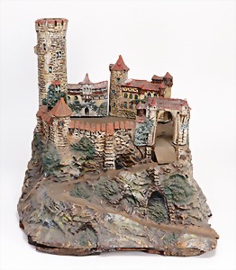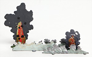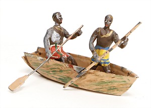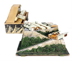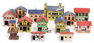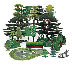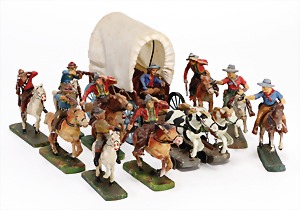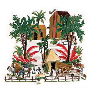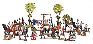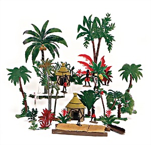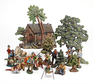 Trapperfiguren, 13-tlg., Masse, passend zu 7,5 cm, 1 Blockhütte mit Palme, Gebäude, Geländeteile, 1 Feuer, Baum H: 19 cm, meist Zust. 2-3