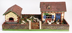 Bauernhof, Gebäude mit Stallung, Holz, Masse, 36 x 60 cm, H: 22 cm, Türscharnier lose, sonst bis auf kl. Stellen guter Zust., mit Masse-Federvieh