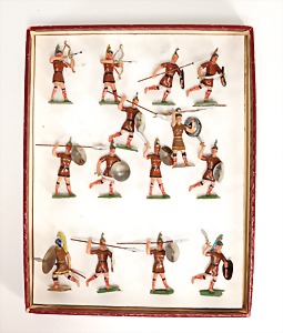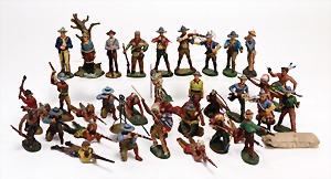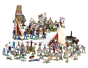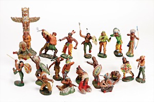meist Elastolin u. Lineol, 19-tlg., Masse, Indianer, Lagerleben, dazu 1 Feuerstelle, 1 Feuerstelle mit Fleischspieß, passend zu 7/7,5 cm, meist Zust. 2-3