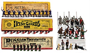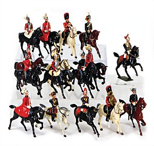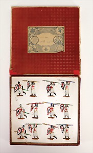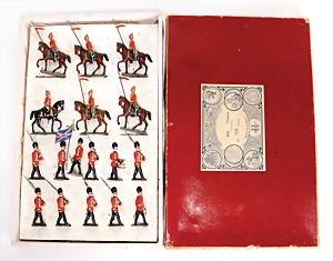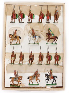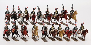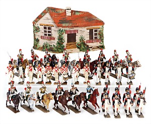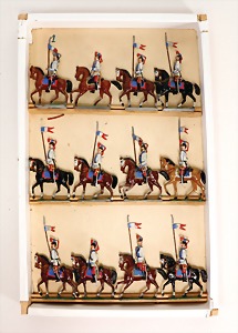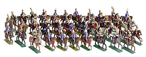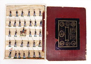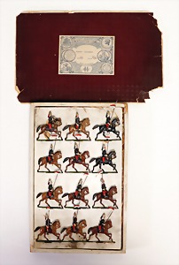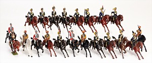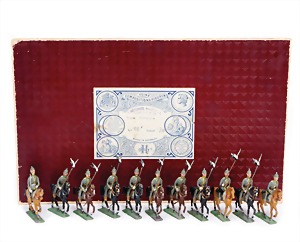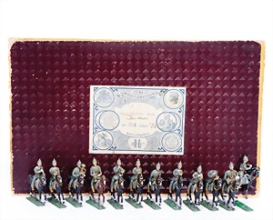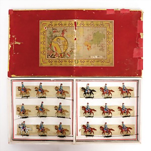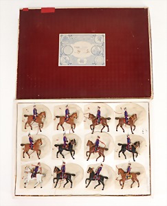 Zinn-Kompositionsfiguren, 5 cm, plastisch, Kavallerie, Nr. 69 2/12, guter Zust., im Orig.-Kart., Kart. altersbed. verschlissen, Seitenlaschen am Kart. fehlen, Ecken am Deckel fehlen