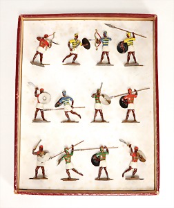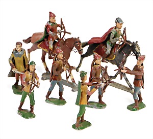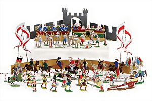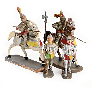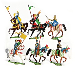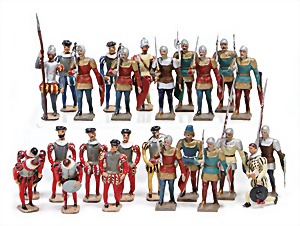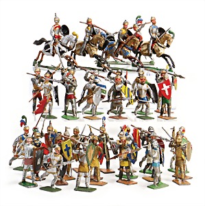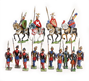 12 Teile Ritterfiguren, plastisch, 5 cm, CBG, Frankreich, marschierend, Lanzenträger, Mann mit Armbrust, etc., meist Zust. 2, schöne Dekoration f. eine frühe Ritterburg, dazu 13 Teile Hofstab