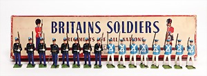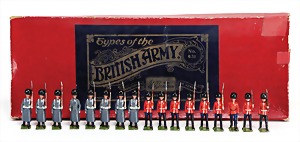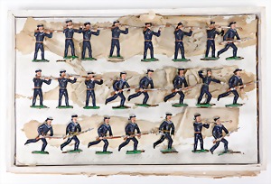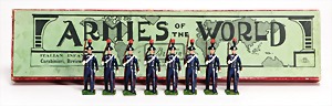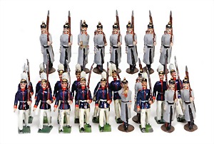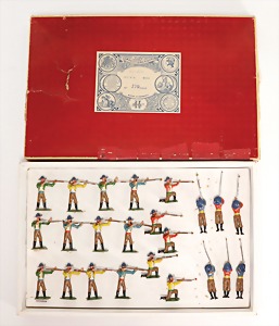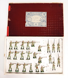 Zinn-Kompositionsfiguren, russische Infanterie, Feuer, Nr. 170 2/23, liegend u. stehend feuernd, guter Zust., im Orig.-Kart., Seitenlaschen am Kart. fehlen