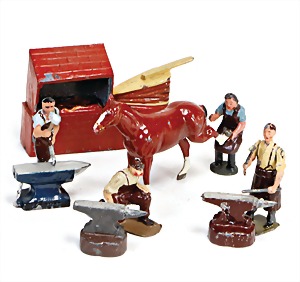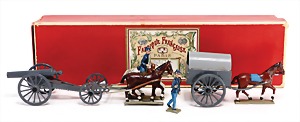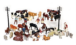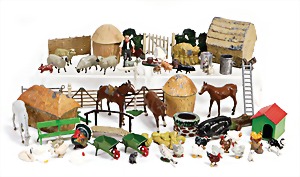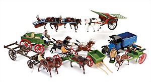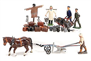 Ausschmückungsteile f. Bauernhof u. Eisenbahn, Gepäckstücke, Koffer, Zugpferd mit Wagen, Figuren mit Sackkarren, passend zu 5,5 cm Figuren, meist Zust. 2