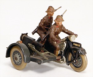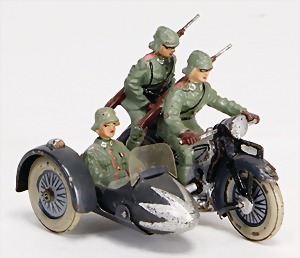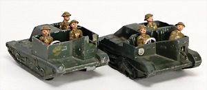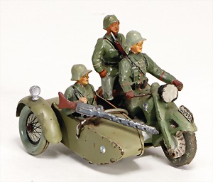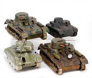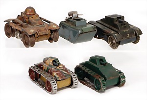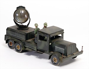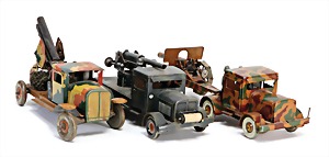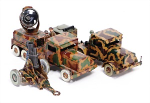 LKW, Auflieger, Kanone mit Ketten, 1 Lkw 3-Achser,Flakgeschütz, Uhrwerk intakt, Kleinteile fehlen, 1 Lkw mit Geschütz (Geschütz orig.?), Uhrwerk intakt, ein wenig Flugrost, bespielt bis gut