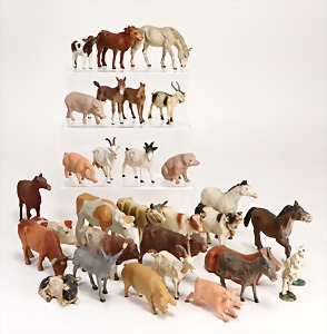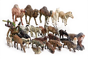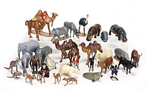 ca. 25 Teile, Masse, Wildtiere, Dromedar, Lama, Zebra, Affen, Faultier auf Baumstumpf, etc., meist Zust. 2, ein paar Teile beschädigt