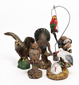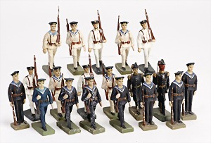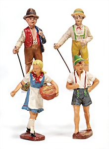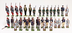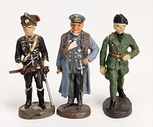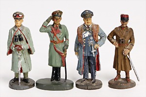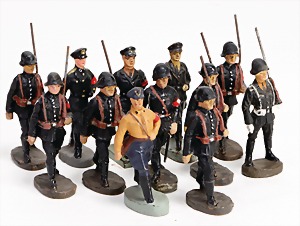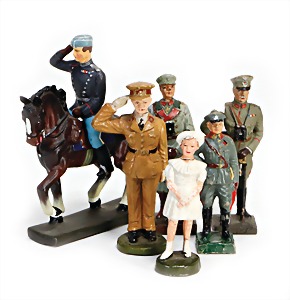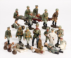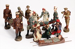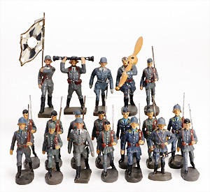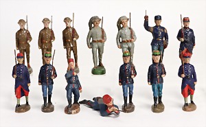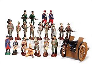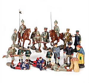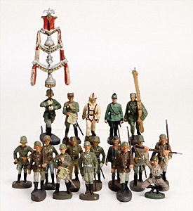 Massefiguren, 1. Weltkrieg, 17-tlg., meist 10 cm, dazu 1 Figur mit Schöpfkelle, neuer, 1 Wärter, 1 Hexe, 1 Schäfer, meist Zust. 2-3