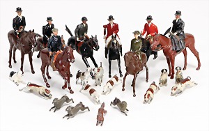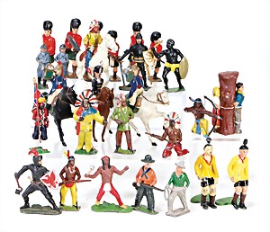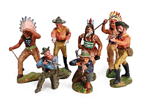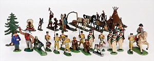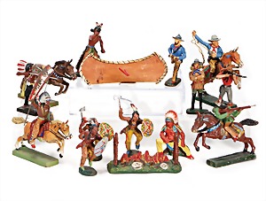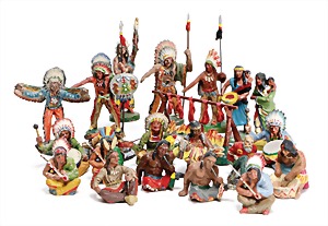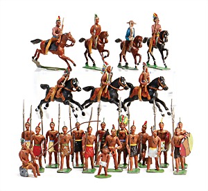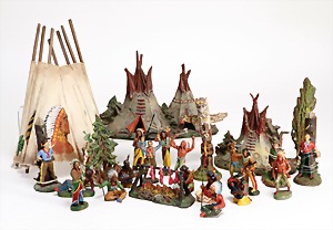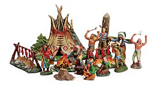 meist Elastolin u. Lineol,10-tlg., Indianerfiguren, Masse, Trapper am Marterpfahl, Häuptlinge, Lagerleben, 2 Feuerstellen mit Fleischspießen, 1 Tipi, 1 Feuerstelle, meist Zust. 2-3