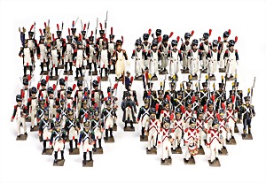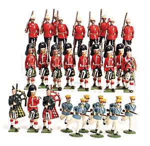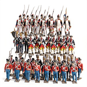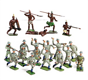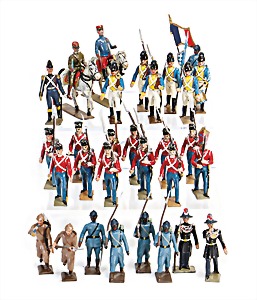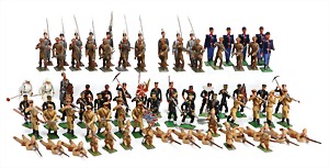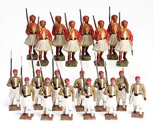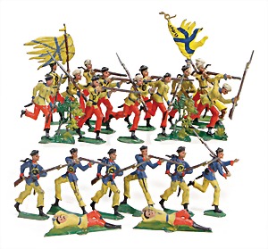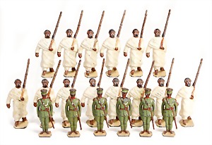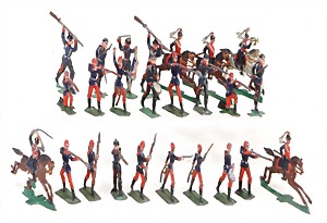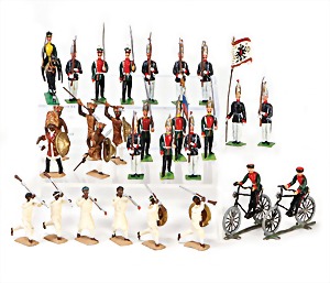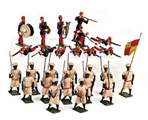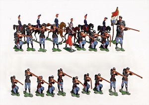 Inder u. Franzosen, 26 Teile, kämpfend, 1 Fahnenträger, ein paar Musiker, 5,5 cm, meist Zust. 2