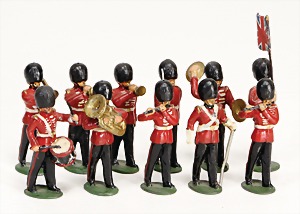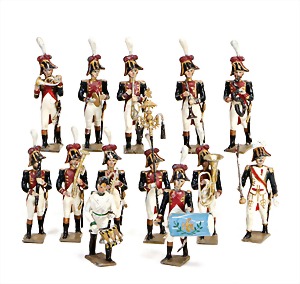feine Zinn-Kompositionsfiguren, preußische Kürassiere, Musiker, 12 Teile, davon 1x kopflos u. Fußteil weggebrochen, sonst meist Zust. 2, im Orig.-Kart., Seitenlaschen am Kart. fehlen