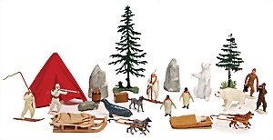 Polarexpress, 4,5 cm Figuren, mit Schlitten, Zelt, Wildtiere, Hundegespann, meist guter Zust., im Kart., ohne Aufdruck, Kart. altersbed. verschlissen