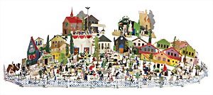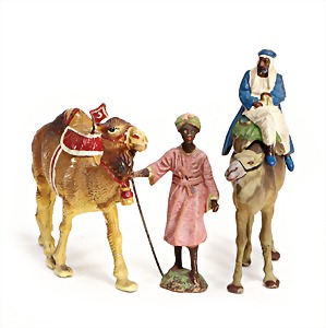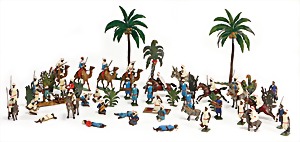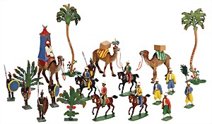 Beduinendorf, Kamelreiter, Reiter zu Pferd, Eselsreiter, Lageleben, Musikanten, Mann beim Beten, Sträucher, Palmen, Heyde Zinn- Kompositionsfiguren, 5,5 cm, meist Zust. 2, ausgefallen