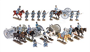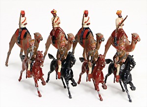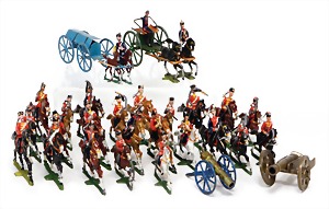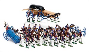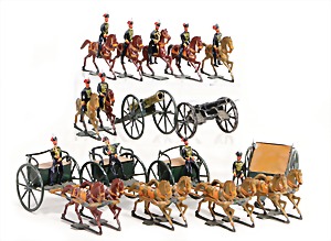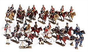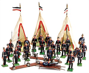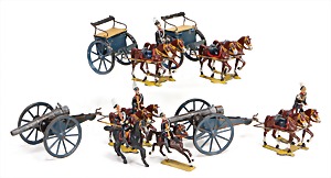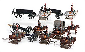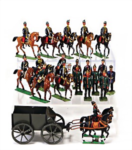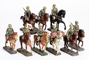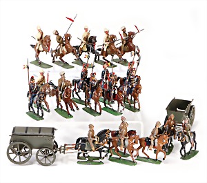 Plastische Kompositionsfiguren, 5,5 cm, 11 Teile, Kavallerie, Figuren mit Säbel aus dem Halfter ziehend, absolut selten, Blech-Sattel, Tränke-Eimer mit Vorrichtung, 3 Zelte, ausgefallen