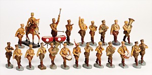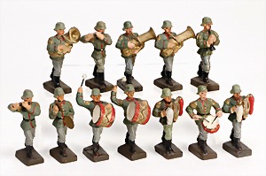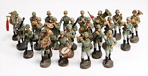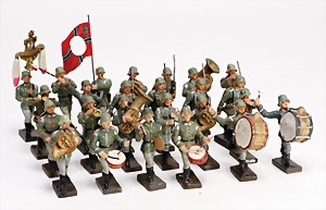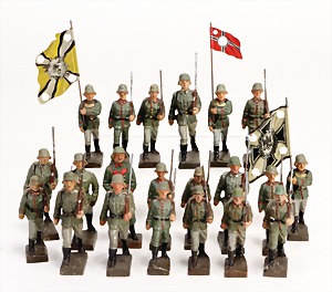 meist Elastolin, 17-tlg., 7,5 cm, 2. Weltkrieg, gr. Standartenträger, Mann im Drill, marschierende Figuren, Hauptmann marschierend im Stechschritt, meist Zust. 2-3