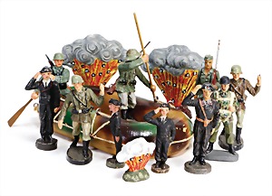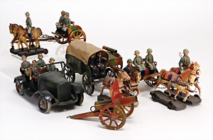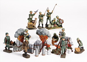 2. Weltkrieg,meist Elastolin u. Lineol, Masse, Granatstapel, Gewehrstapel, gr. u. kl. Granatfeuer, Figuren Granaten tragend, Mann mit Brieftaube, Figurenpaar mit Telefon, meist Zust. 2