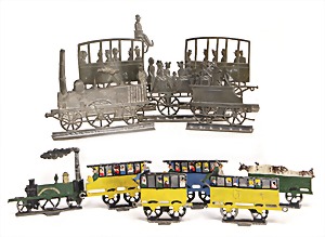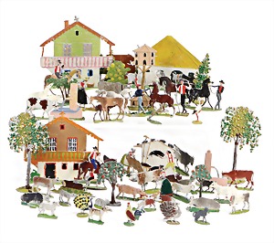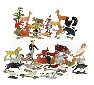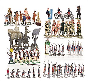Konv. ca. 100 Teile flache u. halbplastische Zinnfiguren, untersch. Hersteller, darunter kl. Spanschachtel, Garten, Figuren u. Pflanzen in Spanschachtel