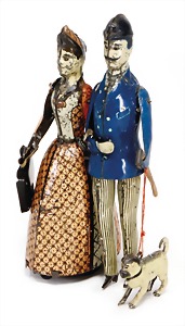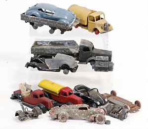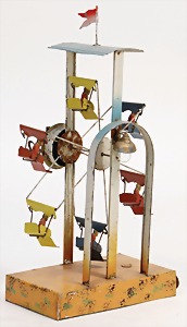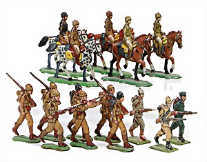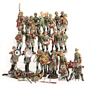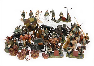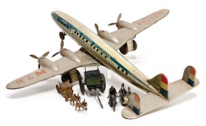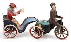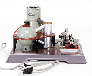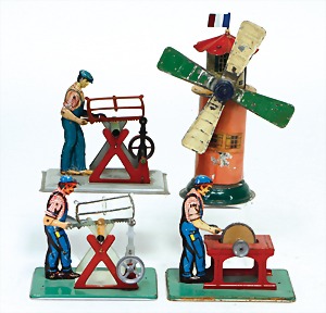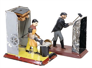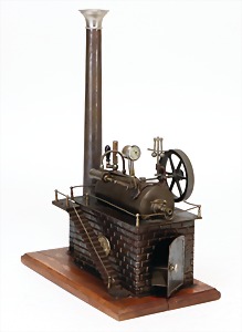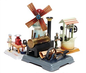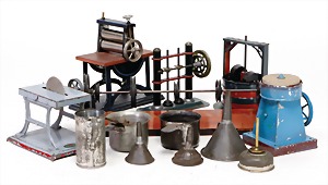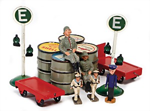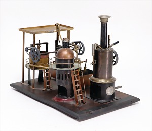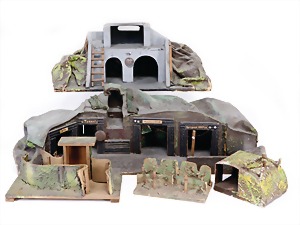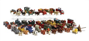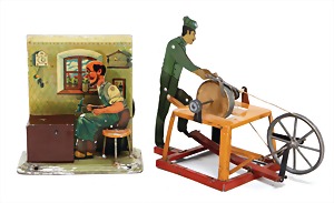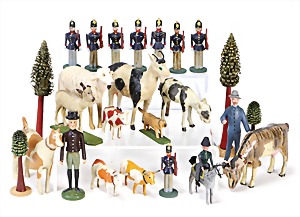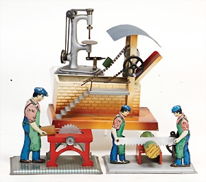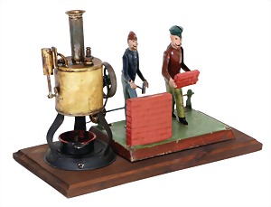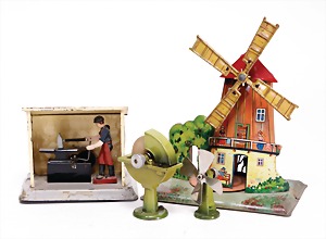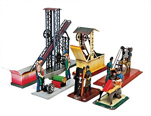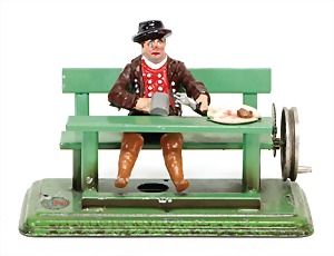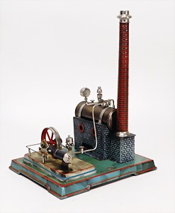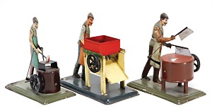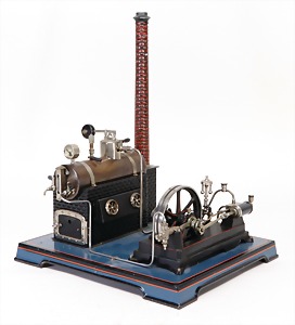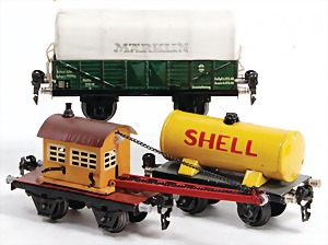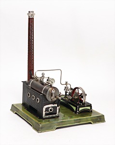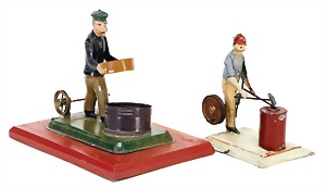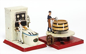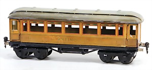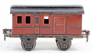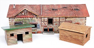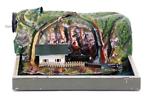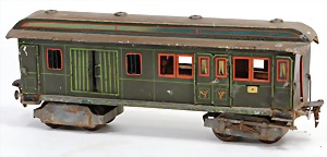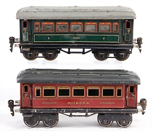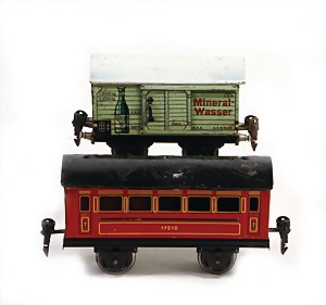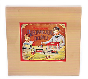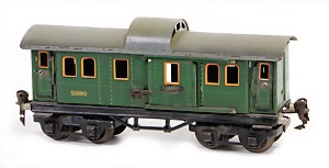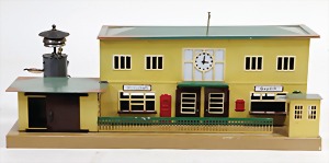 Uralt, Zentral-Bahnhof, 2142, Spur 1, beige, 2 Seitengebäude, Glasfenster, Wartesaal, Telegraph, geprägte Dächer, mit Isolatoren u. Ziergittern, Kerzenbeleuchtung, 3-tlg. Mitteldurchgang, mit Zwiebeltürmen, Aufsatz mit Gußfahne, Läutewerk mit Inneneinrichtung, Sitzgruppe, Fahrkarten, Gepäckaufgabe, Grundplatte 65x39 cm, H: 41 cm, am Turm sowie am Giebel vorne farbl. etwas ausgebessert, Geländer an 1 Seite ergänzt, 1 Seite ohne Geländer, an 1 Seite 3 Orig.-Fenster, an 1 Seite alle Fenster orig., schöne Farben, Orig.-Bemalung