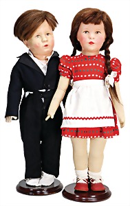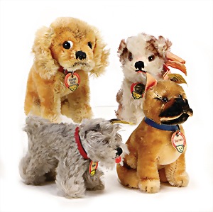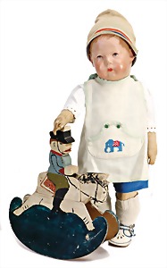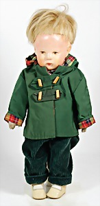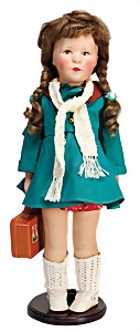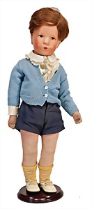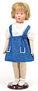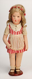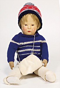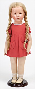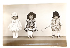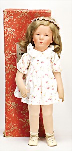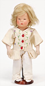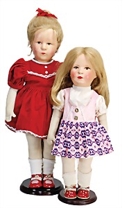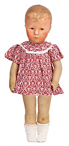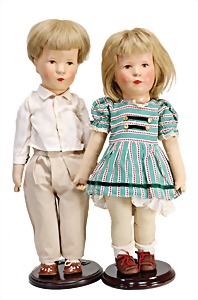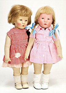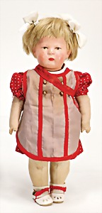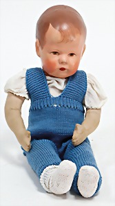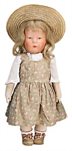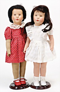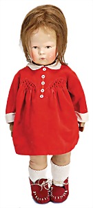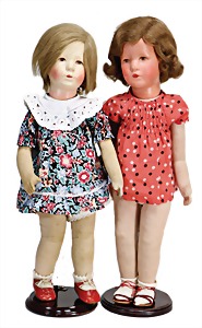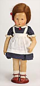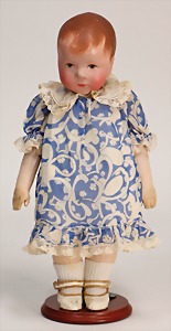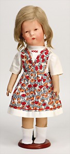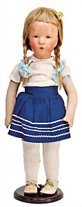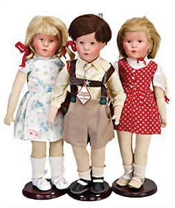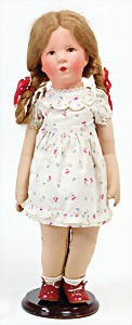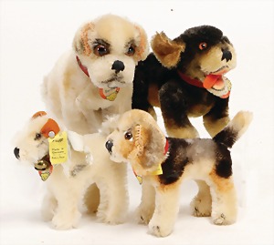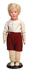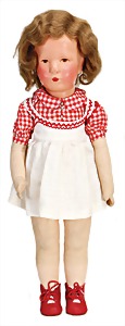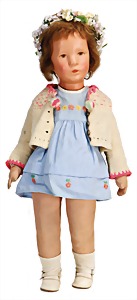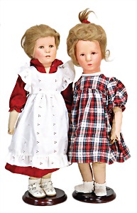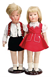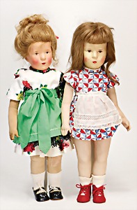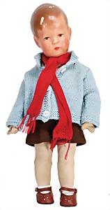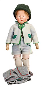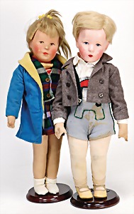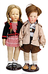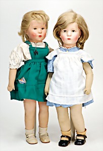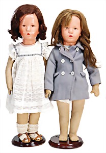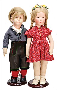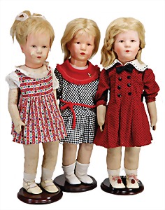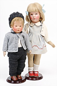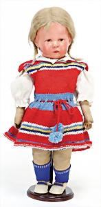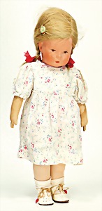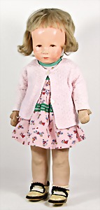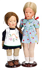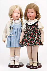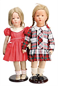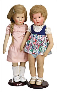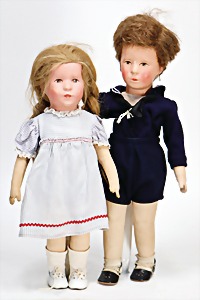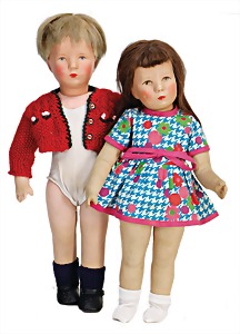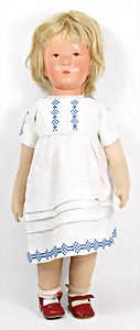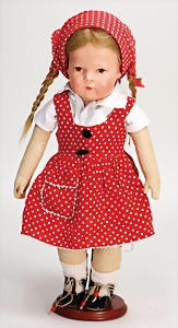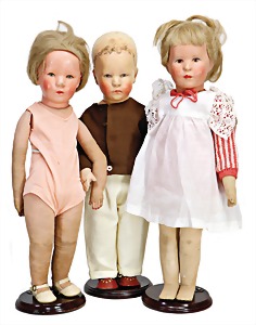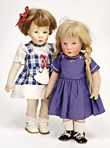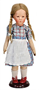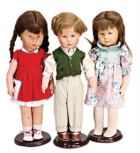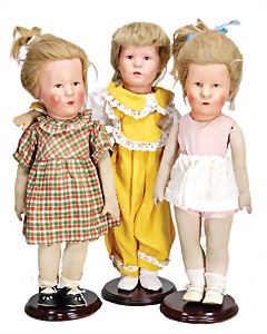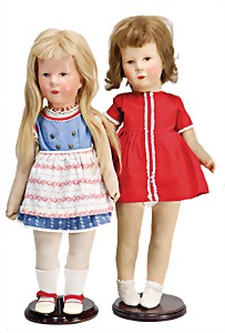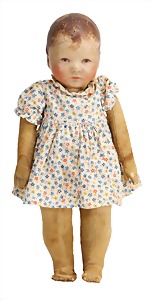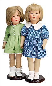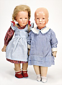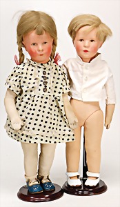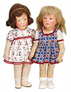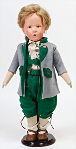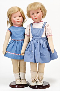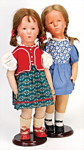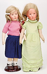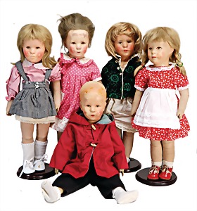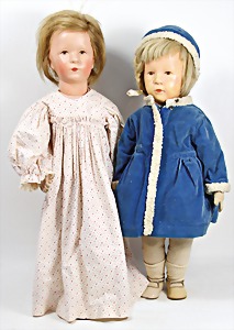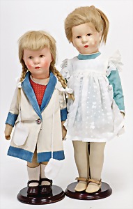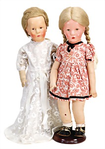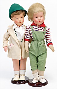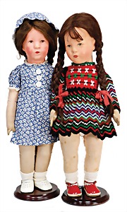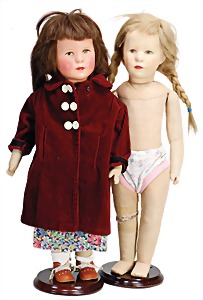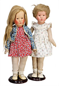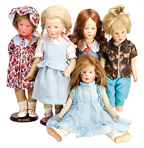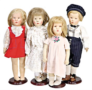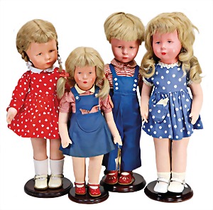 Konv. 4-tlg., 1x Friedebald, Stoffkopf, braune gemalte Augen, teilw. farbl. ausgebessert, sowie Rissbildung im Gesicht, 35 cm, Trikot-Körper, bespielt, Fingerspitzen nachträglich überarbeitet, sowie 2 offene Stellen, 1x Ilsebill, Nachkrieg, Kunststoffkopf, braune gemalte Augen, teilw. farbl. ausgebessert, Trikot-Körper in gutem Zust., 1x Ilsebill, Nachkrieg, Kunststoffkopf, grüne gemalte Augen, Kopf farbl. ausgebessert, Trikot-Körper in gutem Zust., schöne Kleidung, 1x Friedebald, Stoffkopf, grüne gemalte Augen, Trikot-Körper in gutem Zust., 35 cm, Perücke fehlt
