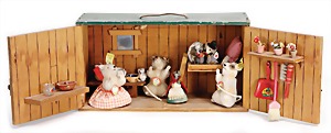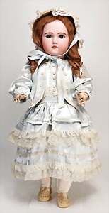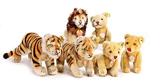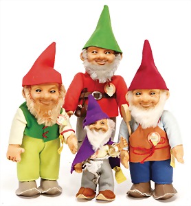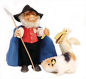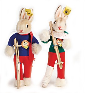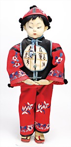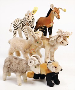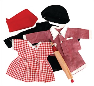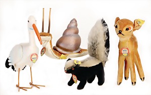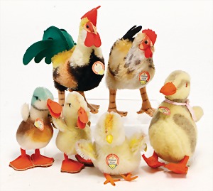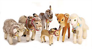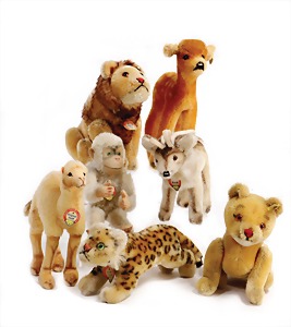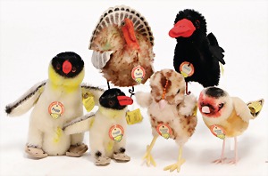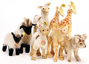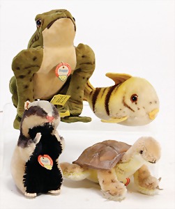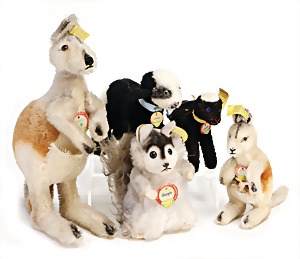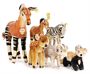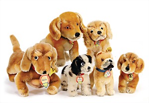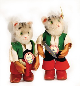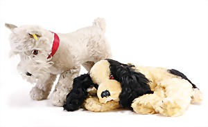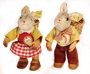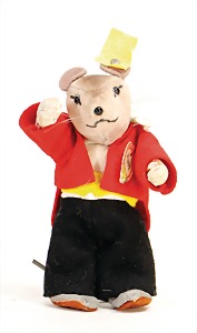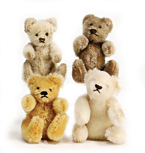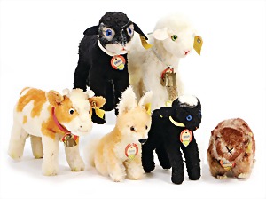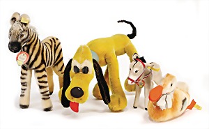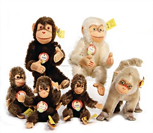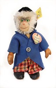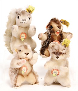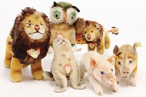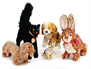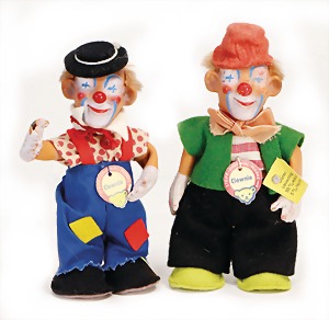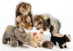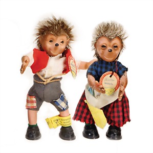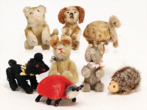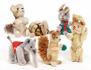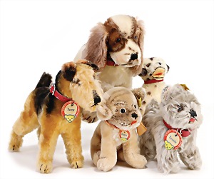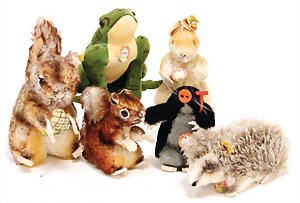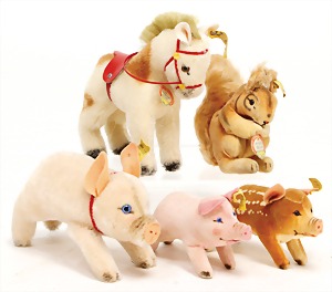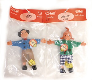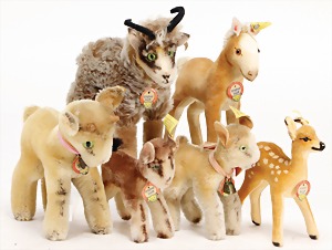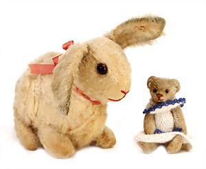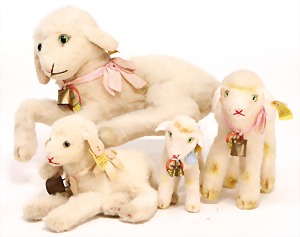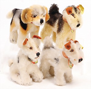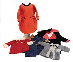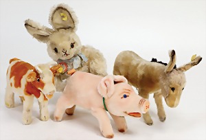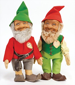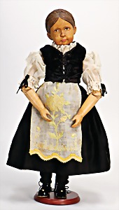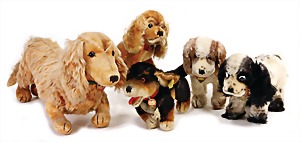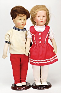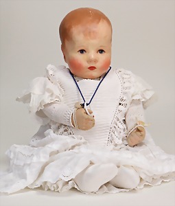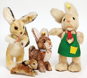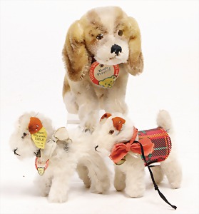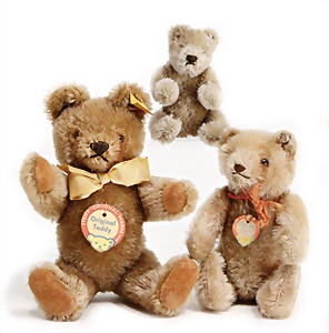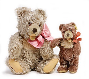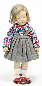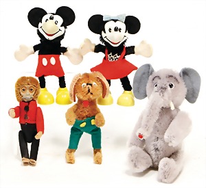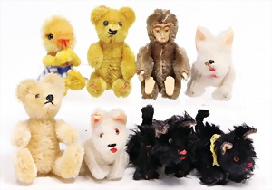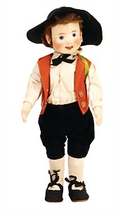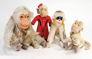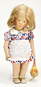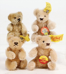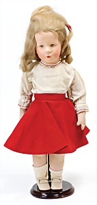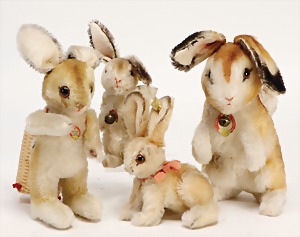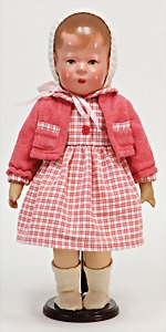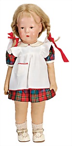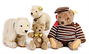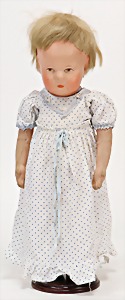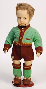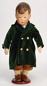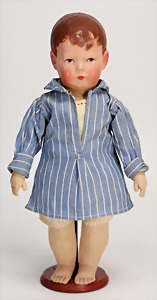 Konv. 4-tlg., 1x Friedebald, Stoffkopf, braune gemalte Augen, teilw. farbl. ausgebessert, sowie Rissbildung im Gesicht, 35 cm, Trikot-Körper, bespielt, Fingerspitzen nachträglich überarbeitet, sowie 2 offene Stellen, 1x Ilsebill, Nachkrieg, Kunststoffkopf, braune gemalte Augen, teilw. farbl. ausgebessert, Trikot-Körper in gutem Zust., 1x Ilsebill, Nachkrieg, Kunststoffkopf, grüne gemalte Augen, Kopf farbl. ausgebessert, Trikot-Körper in gutem Zust., schöne Kleidung, 1x Friedebald, Stoffkopf, grüne gemalte Augen, Trikot-Körper in gutem Zust., 35 cm, Perücke fehlt