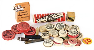 Konv. bestehend aus Gummi-Granaten, Märklin 8161, ??? 100 Schuss-Bänder, Centifix Schuss-Bänder, 1 Anstecknadel Lineol,