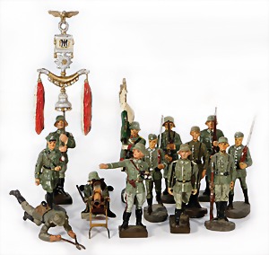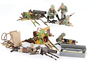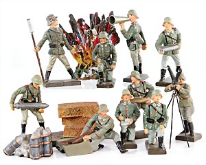 Konv. 13-tlg., 2. Weltkrieg, 7,5 cm, darunter Standarten-Träger, 1 Maschinengewehr-Schütze, Figuren Still Gestanden, meist Zust. 2-3