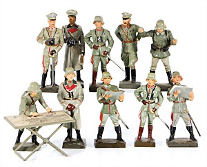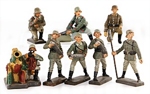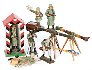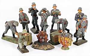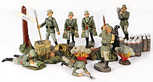 Masse, 2. Weltkrieg, 7,5 cm, 10-tlg., Figuren mit Gasmaske, Gasmelder am Gasofen, meist Zust. 2-3, ein paar Figuren Schlechter