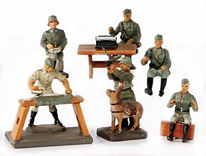 Masse, 2. Weltkrieg, 7,5 cm, Mann am Bügelbrett, Mann mit Schreibmaschine, Lagerleben, 6-tlg., meist Zust. 2-3