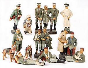 2. Weltkrieg, Masse, 7,5 cm, 10-tlg., Figuren Szenen, Ärzte, Verwundete, Krankenschwester, dazu 1 Hund, Zust. 2-3