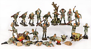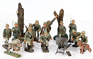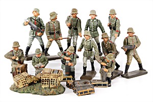 Masse, 7,5 cm, 2. Weltkrieg, 12-tlg., marschierend, kämpfend, dazu 1 Hund, 2 Bäume, 1 Granatfeuer, meist Zust. 2-3