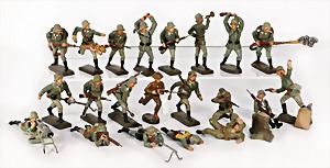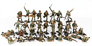 7,5 cm, 2. Weltkrieg, Masse, kämpfend und marschierend, 1 Fahnen-Träger Masse, 1 Fahnen-Träger Blech, 1 Fahne übermalt, 22 Teile, meist Zust. 2-3, Engländer