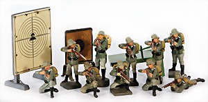 2. Weltkrieg, Masse, 7,5 cm, 9-tlg., marschierend, teilw. mit Stechschritt, Still Gestanden, 1x kniend schießend, Tropen-Uniform, Zust. 2-3