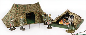 2 Zelte, Pappe, Stoff, einige Figuren Elastolin & Lineol, 1 Soldat beim Liebesspiel, wohl später, Zust. 2