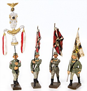 4-tlg., 3 Fahnenträger mit Blechfahne, 1 Standartenträger, passend zu 7,5 cm, meist Zust. 2