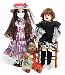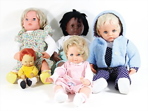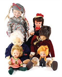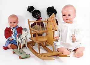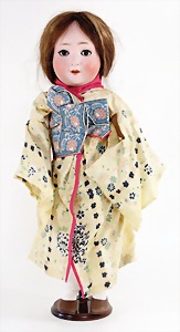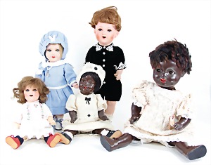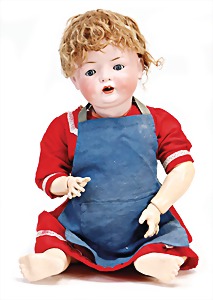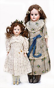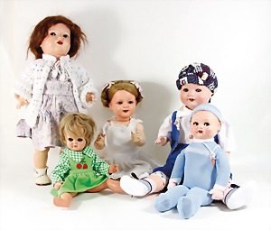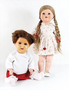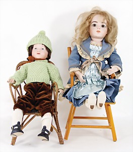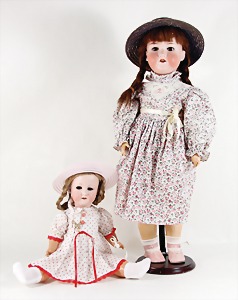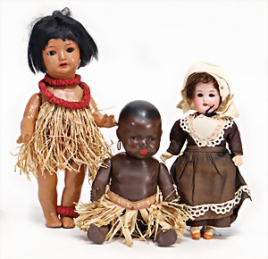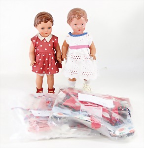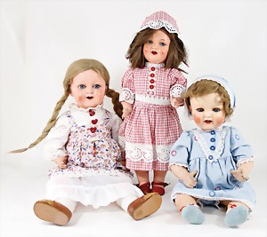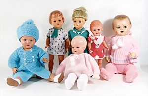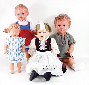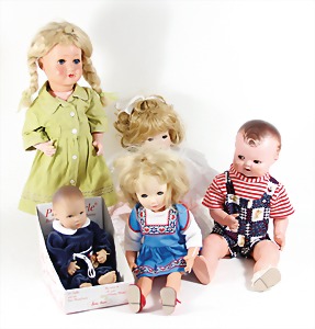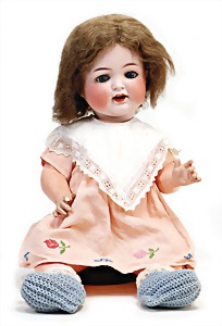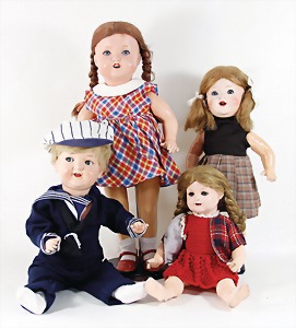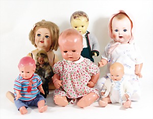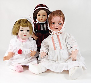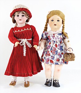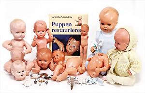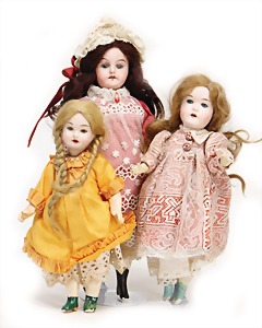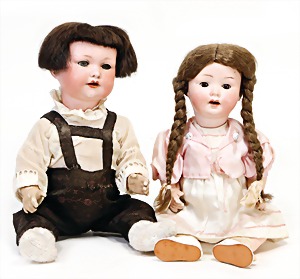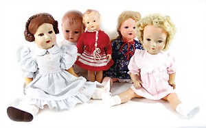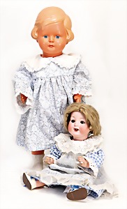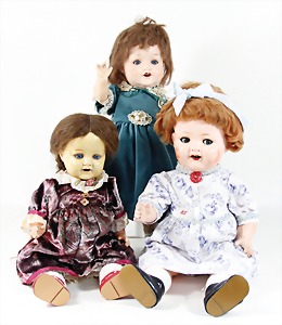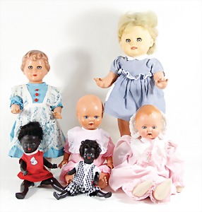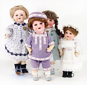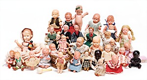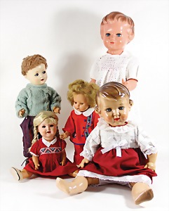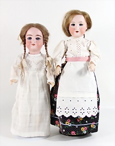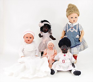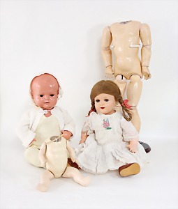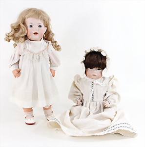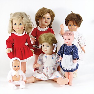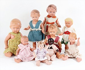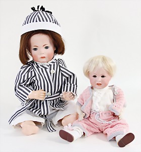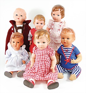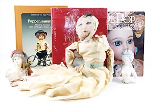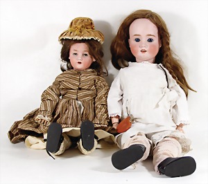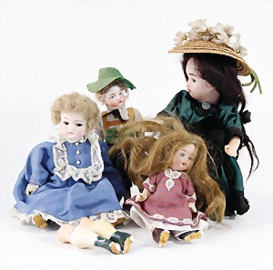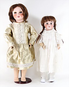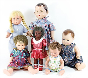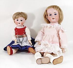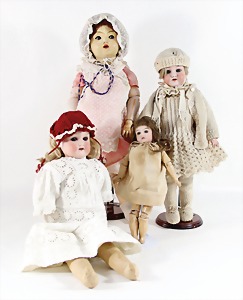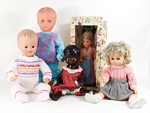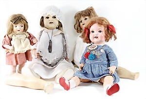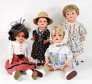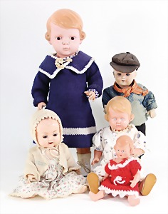 6 Porzellan/Masse/Celluloid-Puppen, darunter AM 390 N, Haarriss am Hinterkopf, blaue Schlafaugen, off. Mund, Zähne weggebrochen, Echthaar-Perücke, auf Masse-Stehbabykörper, stärker bespielt, 45 cm, 1x keramische Werke Germany 136, blaue Schlafaugen, off. Mund, Zähne weggebrochen, neue Kunsthaar-Perücke, Masse-Stehkörper mit Stimme, 42 cm, 1x Heubach Köppelsdorf 342, blaue Schlafaugen, off. Mund, 2 Zähne oben, Kunsthaar-Perücke, Masse-Stehbaby-Körper, 29 cm, 1x König & Wernicke 621/46, dunkel gespritzt mit braunen Schelmen-Augen, off. Mund, Zähne, Kunsthaar-Perücke, Masse-Stehkörper, 45 cm, 1x AM 2966, braune Schlafaugen, off. Mund, Zähne, Kunsthaar-Perücke, Masse-Stehkörper, 34 cm, 1x gem. Emaso, blaue Schlafaugen, geschl. Mund, Echthaar-Perücke, Celluloid-Stehkörper, 34 cm, Kleidung nachgenäht