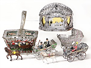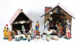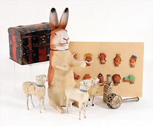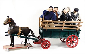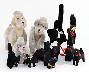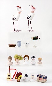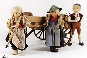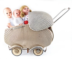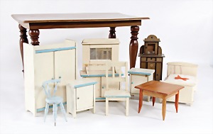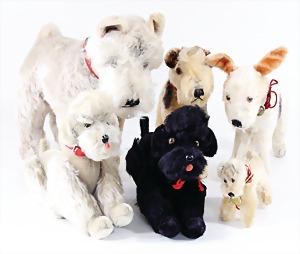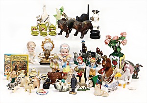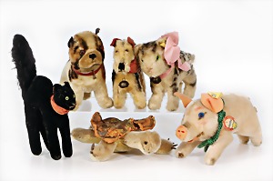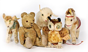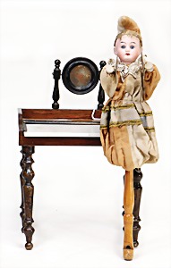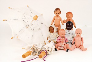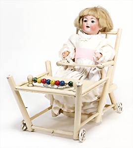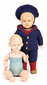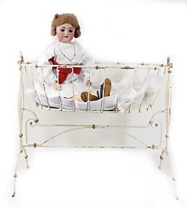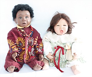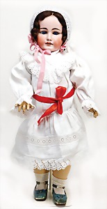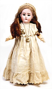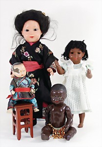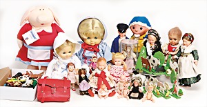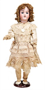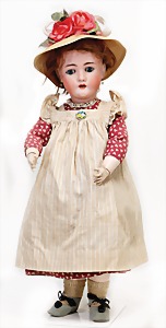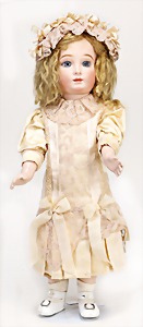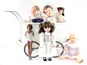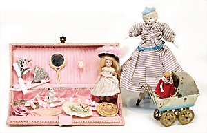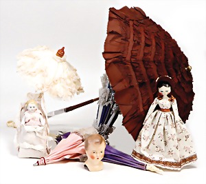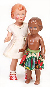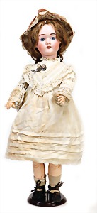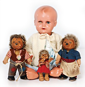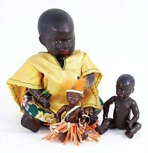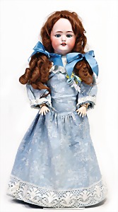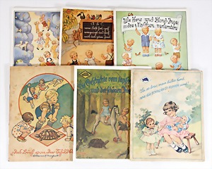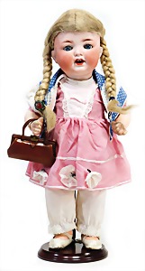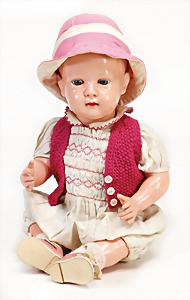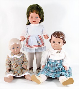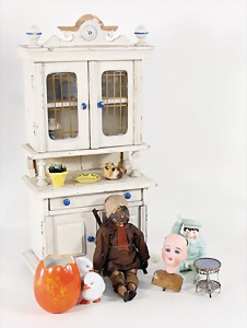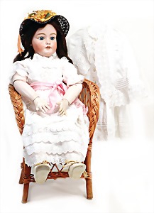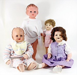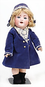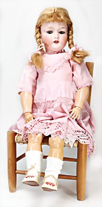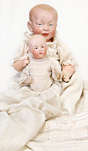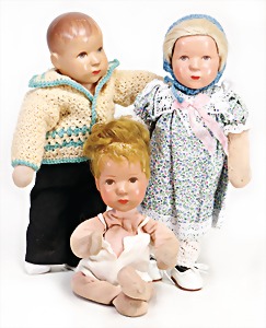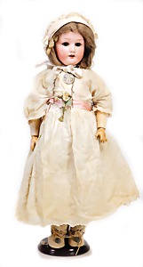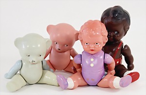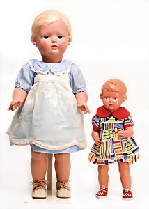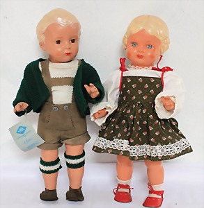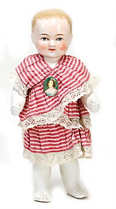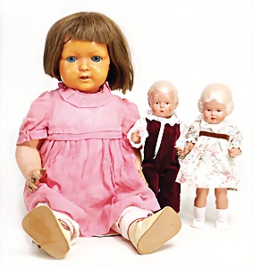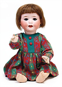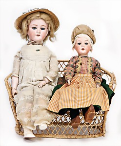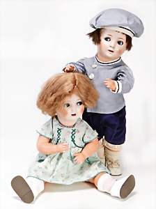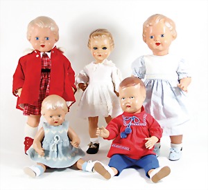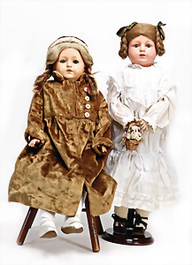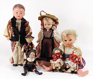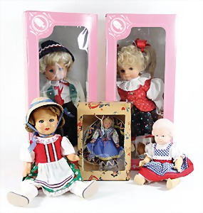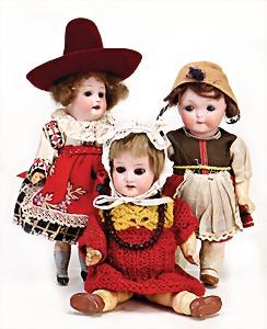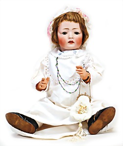 6 Porzellan/Masse/Celluloid-Puppen, darunter AM 390 N, Haarriss am Hinterkopf, blaue Schlafaugen, off. Mund, Zähne weggebrochen, Echthaar-Perücke, auf Masse-Stehbabykörper, stärker bespielt, 45 cm, 1x keramische Werke Germany 136, blaue Schlafaugen, off. Mund, Zähne weggebrochen, neue Kunsthaar-Perücke, Masse-Stehkörper mit Stimme, 42 cm, 1x Heubach Köppelsdorf 342, blaue Schlafaugen, off. Mund, 2 Zähne oben, Kunsthaar-Perücke, Masse-Stehbaby-Körper, 29 cm, 1x König & Wernicke 621/46, dunkel gespritzt mit braunen Schelmen-Augen, off. Mund, Zähne, Kunsthaar-Perücke, Masse-Stehkörper, 45 cm, 1x AM 2966, braune Schlafaugen, off. Mund, Zähne, Kunsthaar-Perücke, Masse-Stehkörper, 34 cm, 1x gem. Emaso, blaue Schlafaugen, geschl. Mund, Echthaar-Perücke, Celluloid-Stehkörper, 34 cm, Kleidung nachgenäht