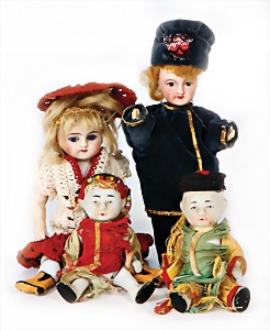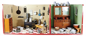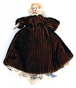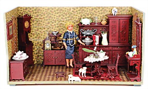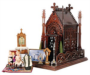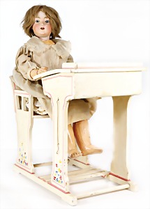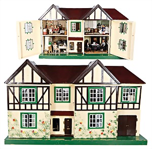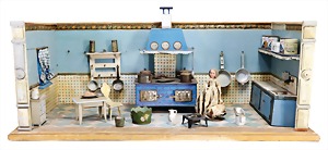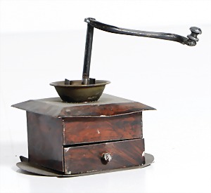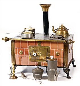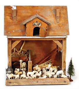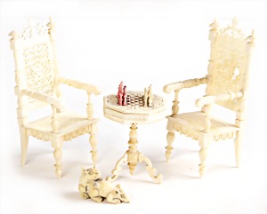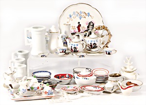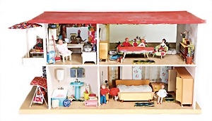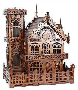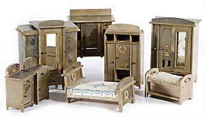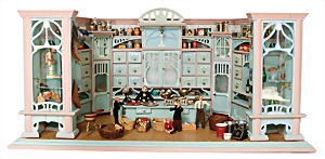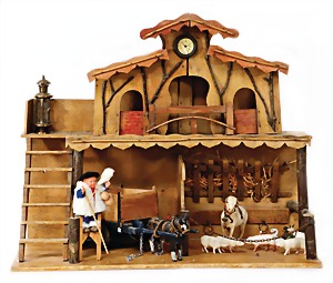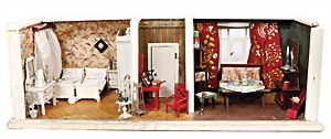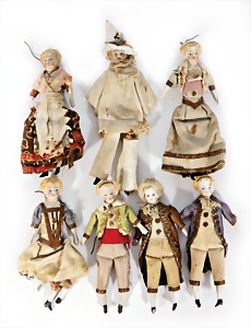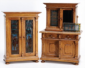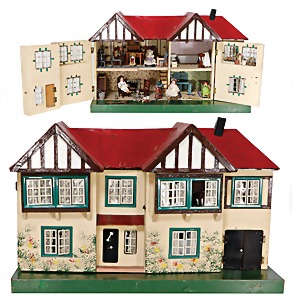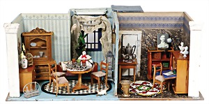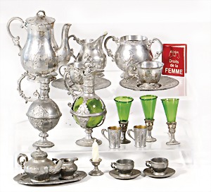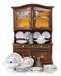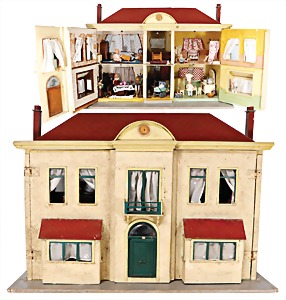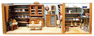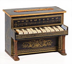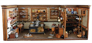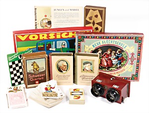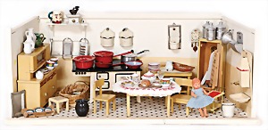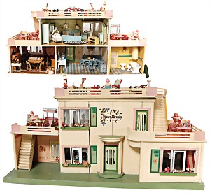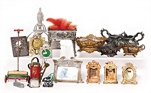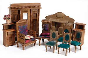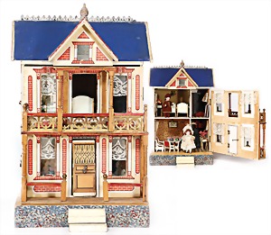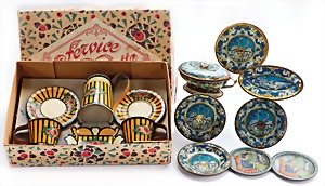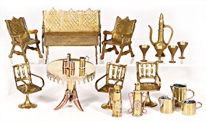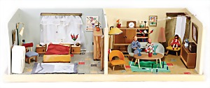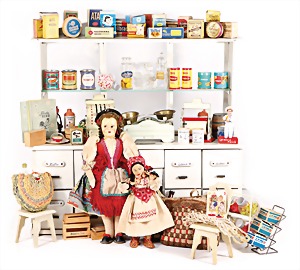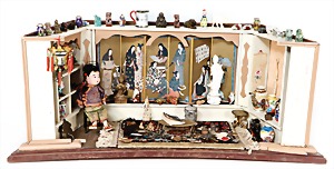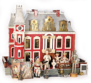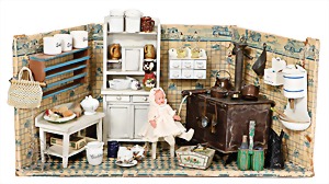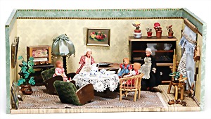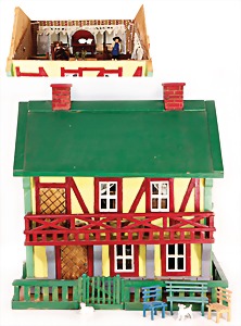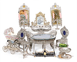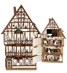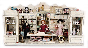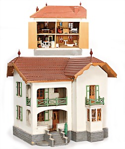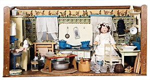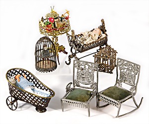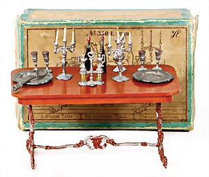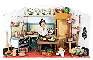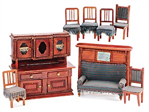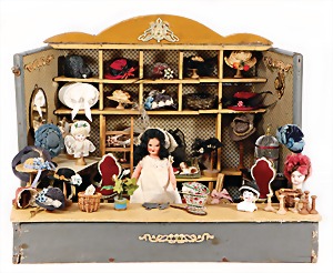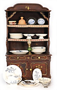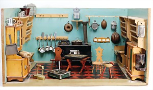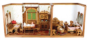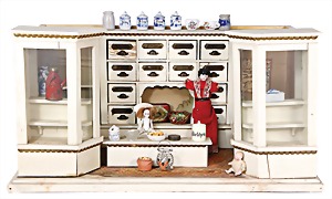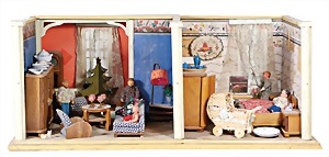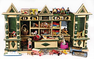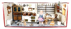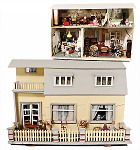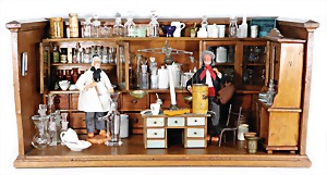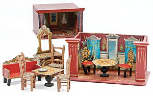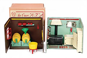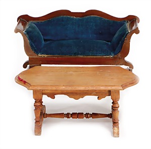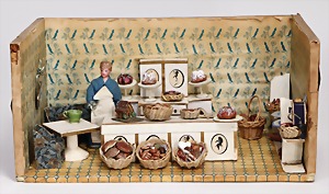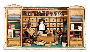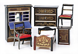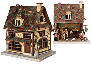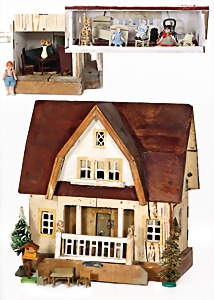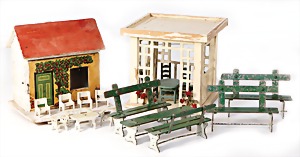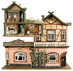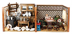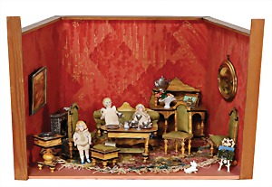 Café, auf Holzsockel, 45 x 27 cm, mit Holzgeländer, aufgesteckte Rückwand, Papier beklebt, mit kleinem Podest, Alter?, darin einige Möbelteile „Boule“, 2 Stühle mit kleinem rundem Tisch, Wachstuch bezogen, mit goldener Prägung und 1x 2 Stühle, 1 Sessel, stoffbezogen, dazu runder Tisch, H: 6,5 cm, 2x Porzellan Kaffeeservice, 1x gem. francais und 1x gem. Limoges, dazu 2 Biedermeier Brustblattkopf-Puppen, Stoffkörper, Porzellan-Arme u. –Unterschenkel, 9,5 cm und 1 Puppenstuben-Mann, Porzellan-Brustblattkopf, modell. Frisur, gemalte Augen, geschl. Mund, Stoffkörper, Porzellan-Arme u. –Unterschenkel mit anmodell. Schuhen, 16,5 cm, Filzanzug mit einer Geige, aufziehbares Spielwerk, nicht intakt