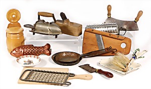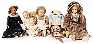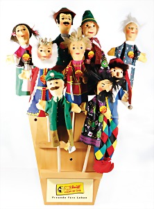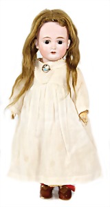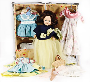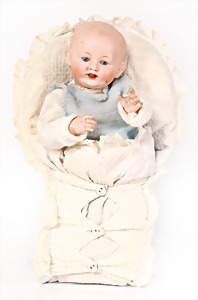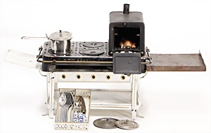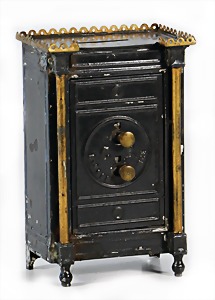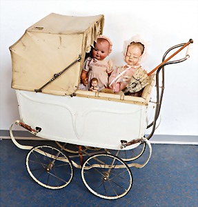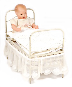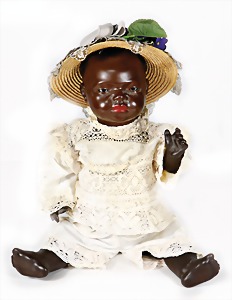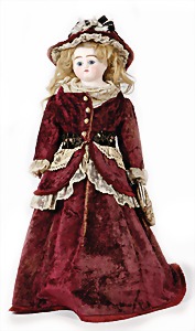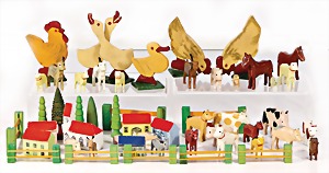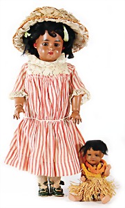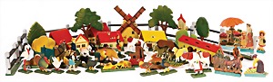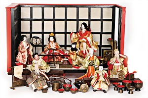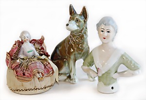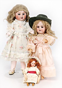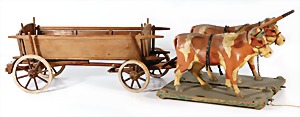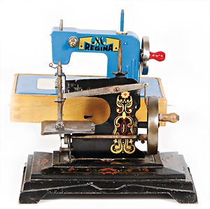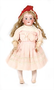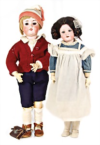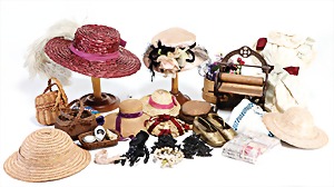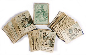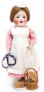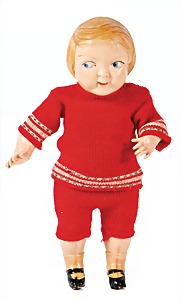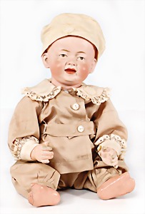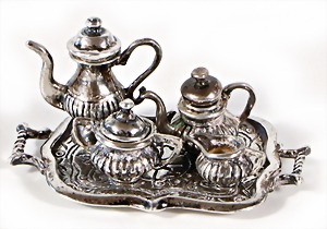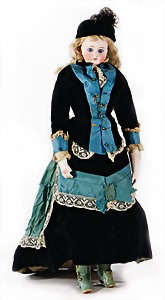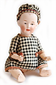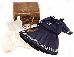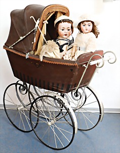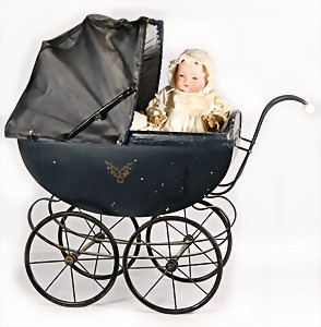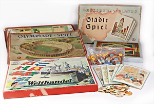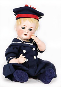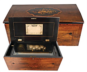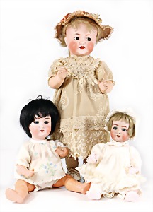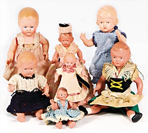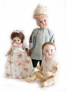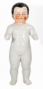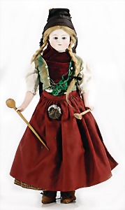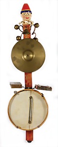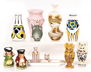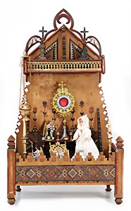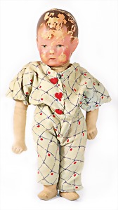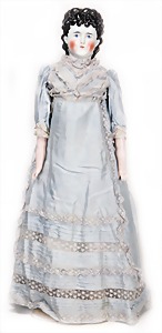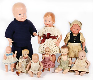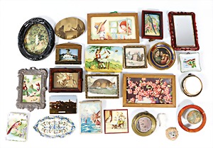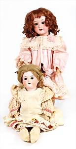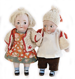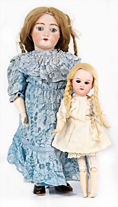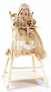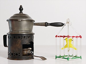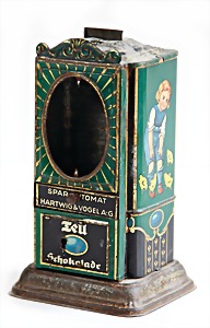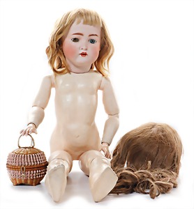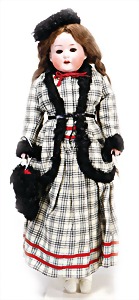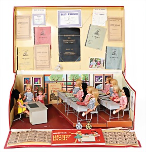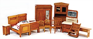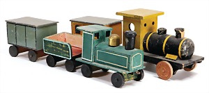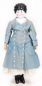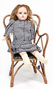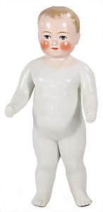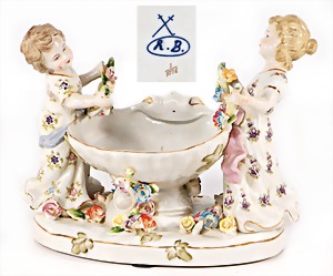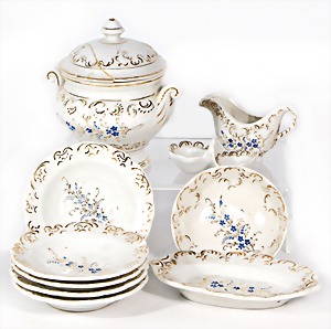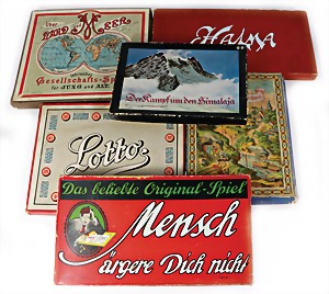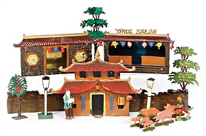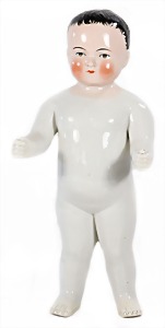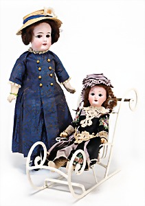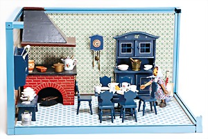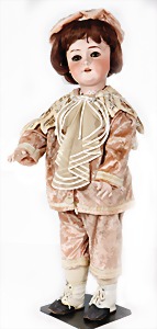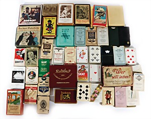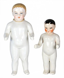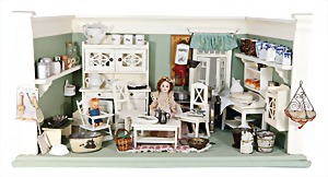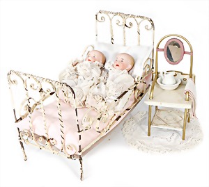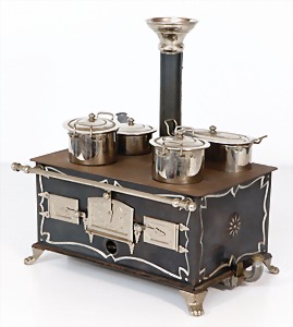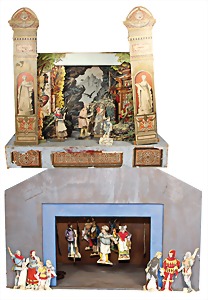 Café, auf Holzsockel, 45 x 27 cm, mit Holzgeländer, aufgesteckte Rückwand, Papier beklebt, mit kleinem Podest, Alter?, darin einige Möbelteile „Boule“, 2 Stühle mit kleinem rundem Tisch, Wachstuch bezogen, mit goldener Prägung und 1x 2 Stühle, 1 Sessel, stoffbezogen, dazu runder Tisch, H: 6,5 cm, 2x Porzellan Kaffeeservice, 1x gem. francais und 1x gem. Limoges, dazu 2 Biedermeier Brustblattkopf-Puppen, Stoffkörper, Porzellan-Arme u. –Unterschenkel, 9,5 cm und 1 Puppenstuben-Mann, Porzellan-Brustblattkopf, modell. Frisur, gemalte Augen, geschl. Mund, Stoffkörper, Porzellan-Arme u. –Unterschenkel mit anmodell. Schuhen, 16,5 cm, Filzanzug mit einer Geige, aufziehbares Spielwerk, nicht intakt