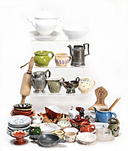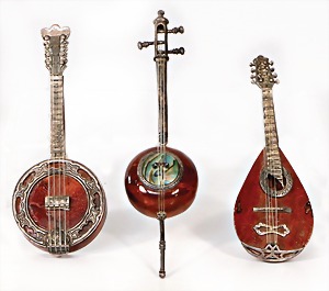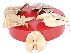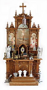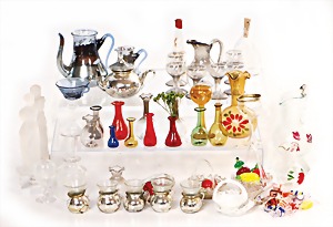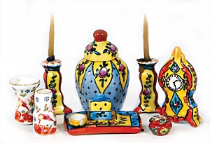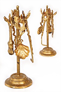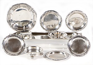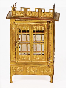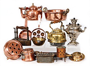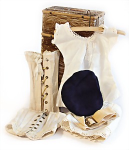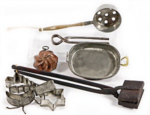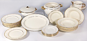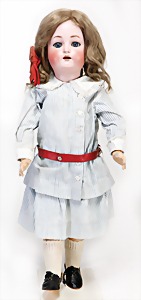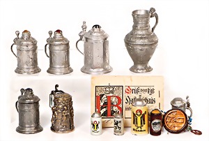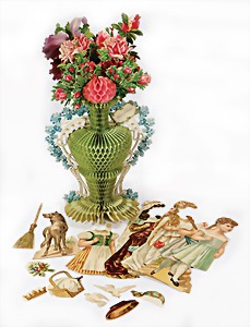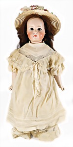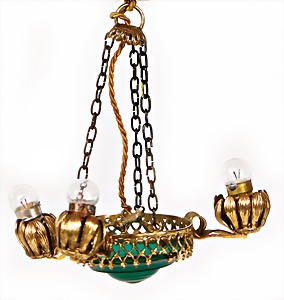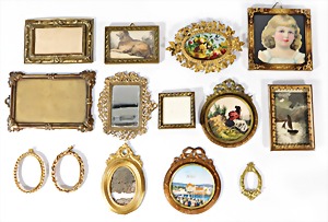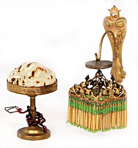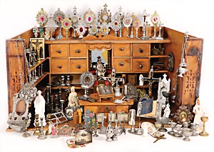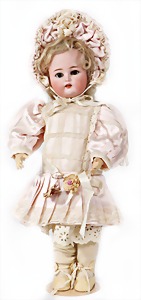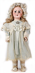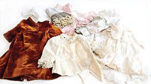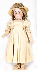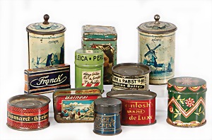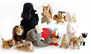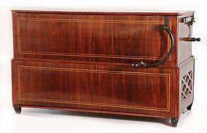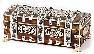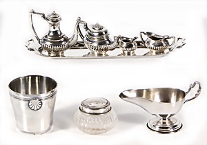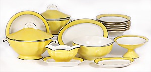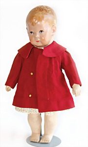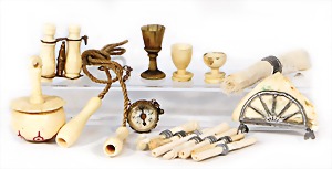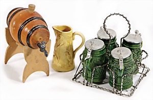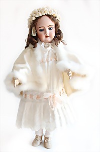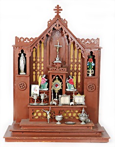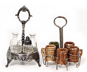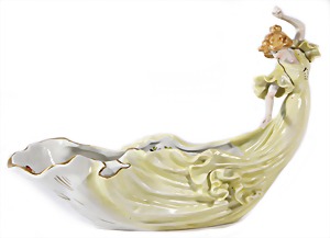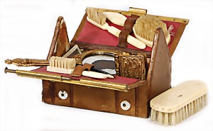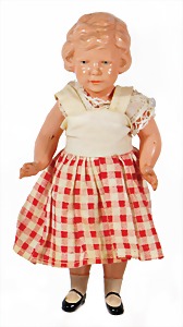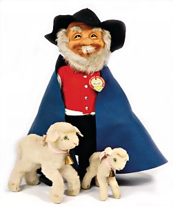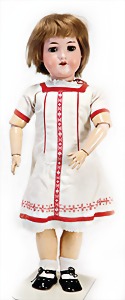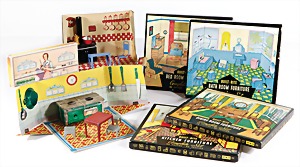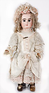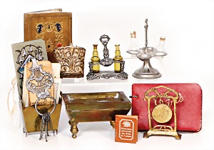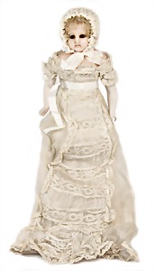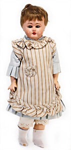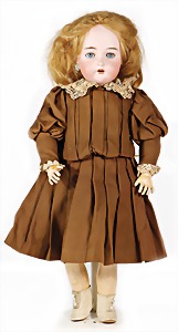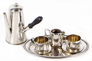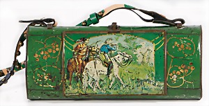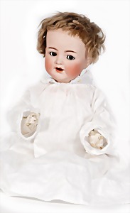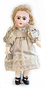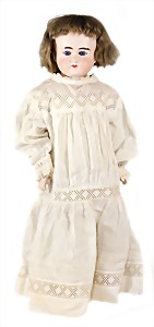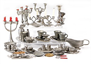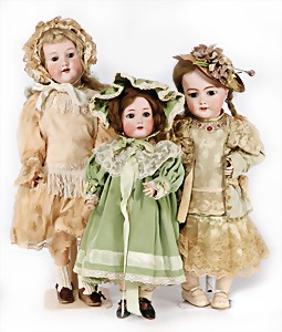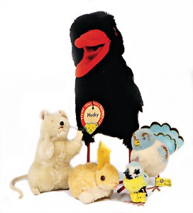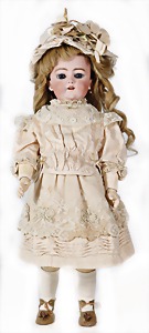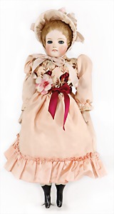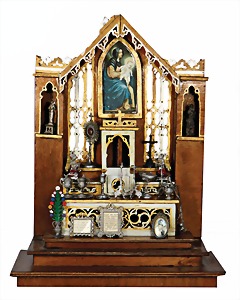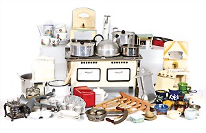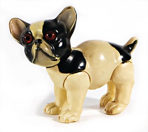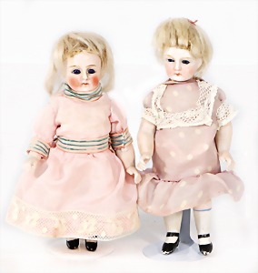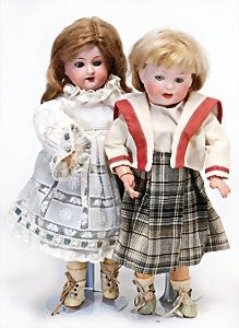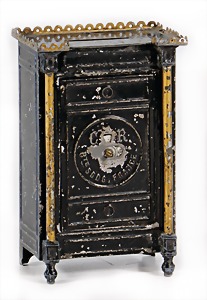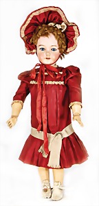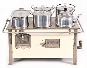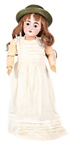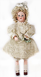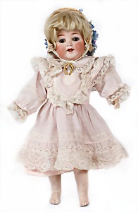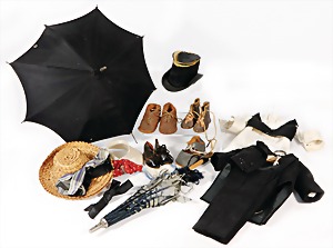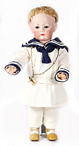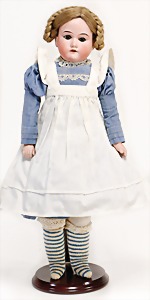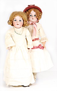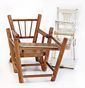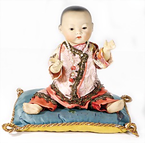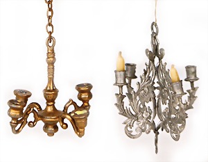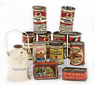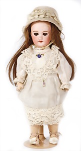 Café, auf Holzsockel, 45 x 27 cm, mit Holzgeländer, aufgesteckte Rückwand, Papier beklebt, mit kleinem Podest, Alter?, darin einige Möbelteile „Boule“, 2 Stühle mit kleinem rundem Tisch, Wachstuch bezogen, mit goldener Prägung und 1x 2 Stühle, 1 Sessel, stoffbezogen, dazu runder Tisch, H: 6,5 cm, 2x Porzellan Kaffeeservice, 1x gem. francais und 1x gem. Limoges, dazu 2 Biedermeier Brustblattkopf-Puppen, Stoffkörper, Porzellan-Arme u. –Unterschenkel, 9,5 cm und 1 Puppenstuben-Mann, Porzellan-Brustblattkopf, modell. Frisur, gemalte Augen, geschl. Mund, Stoffkörper, Porzellan-Arme u. –Unterschenkel mit anmodell. Schuhen, 16,5 cm, Filzanzug mit einer Geige, aufziehbares Spielwerk, nicht intakt