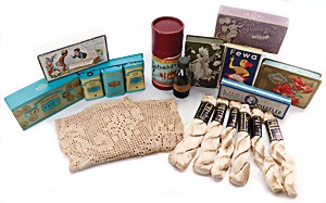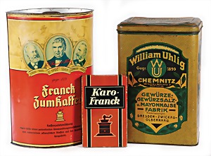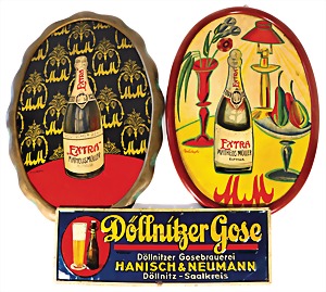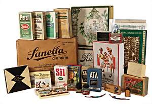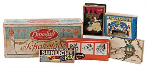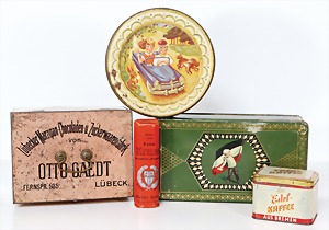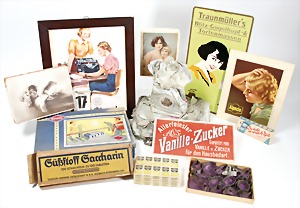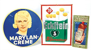 Konv. Werbeaufsteller, ca. 30er Jahre, 1x Plakat Eckstein Zigaretten 5fach garantiert, geprägte Pappe, an den Kanten etwas eingedrückt, B: 34 cm, H: 74 cm, dazu 1x Steinhäger "Echt Westfälischer Urgrossvater", Pappe, H: 36,5 cm, B: 16,5 cm, 1x Marylan- Creme, Pappe, runder Werbeaufsteller, Durchm: 45 cm, altersbed. etwas fleckig, sonst guter Zust.