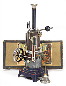 Kl. stehende Dampfmaschine, 26 cm, Wasserstandsglas, Pfeife, mit Schornstein u. Brenner, im Orig.-Kart., techn. nicht geprüft