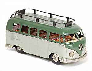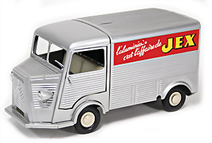 Lieferwagen, Frankreich, mit Werbeaufschrift, 34,5 cm, elektr. beleuchtete Frontscheinwerfer, Uhrwerk intakt, sehr guter Zust., im Orig.-Kart, schwere Blech-Ausführung, 1 Tür zum öffnen, Schiebetüren, Ladetür hinten zum öffnen