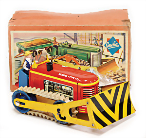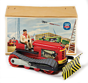 Raupenschieber, Diesel, Blech. lithogr., Uhrwerk intakt, klemmt jedoch ein wenig, 16 cm, guter bis sehr guter Zust., im Orig.-Kart., Fahrer übermalt