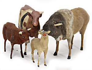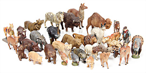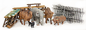 Konv. Masse-Tiere, Elefant, Kamel, Dromedar, 1 Büffel, 1 Hund, Zaunteile, Holz u. Draht, guter Zust.