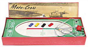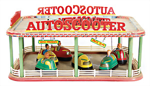 AUTOSCOOTER, Frankreich, Blech- u. Kunststoffteile, Grundplatte, 50 x 36 cm, H: 24 cm, 5 Fahrzeuge, 1 Fahrerfigur sowie 1 Lasche am Draht oben fehlen, 1 seitl. Beschriftung liegt lose bei, Haltezapfen weggebrochen, techn. nicht geprüft, ein wenig eingestaubt, ausgefallen