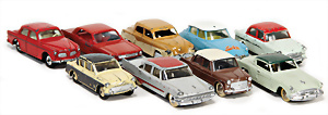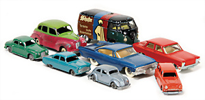 Konv. Modellautos, England, darunter VW, REVALLO, DINKY TOY, GORGY TOY, VW-Bus, geteilte Frontscheibe, „Schufter, Teppiche, Stoffe, Bodenbeläge“, Werbewagen, guter Zust. bis bespielt, 8 Teile